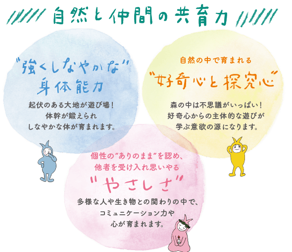 今日は何して遊ぼう?日々変化する自然の中で、子どもたちは感覚を総動員して遊んでいます。虫の形を不思議に思ったり、太陽の暖かさにホッとしたり、葉や実の色をキレイと思ったり、暗くなった空に不安を感じたり…。様々な心の動きは、子どもの内面を豊かにします。起伏のある大地で全身を使って遊ぶことで、体幹が鍛えられしなやかな体も育まれます。