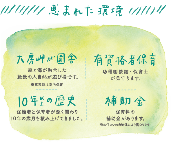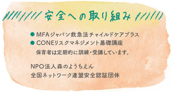 【お米作り】やぎ農園さんのご協力をいただき、もち米を植えています。田植え→草取り→稲刈り→餅つきと、1年を通して「食べものを作る」経験をします。 【野菜作り】「土の中がどうなっているのか見てみたい。」「このお豆がお味噌になるのかー!」野菜作りを通じて、収穫の喜びを味わうと共に植物の生命の不思議に気づきます。